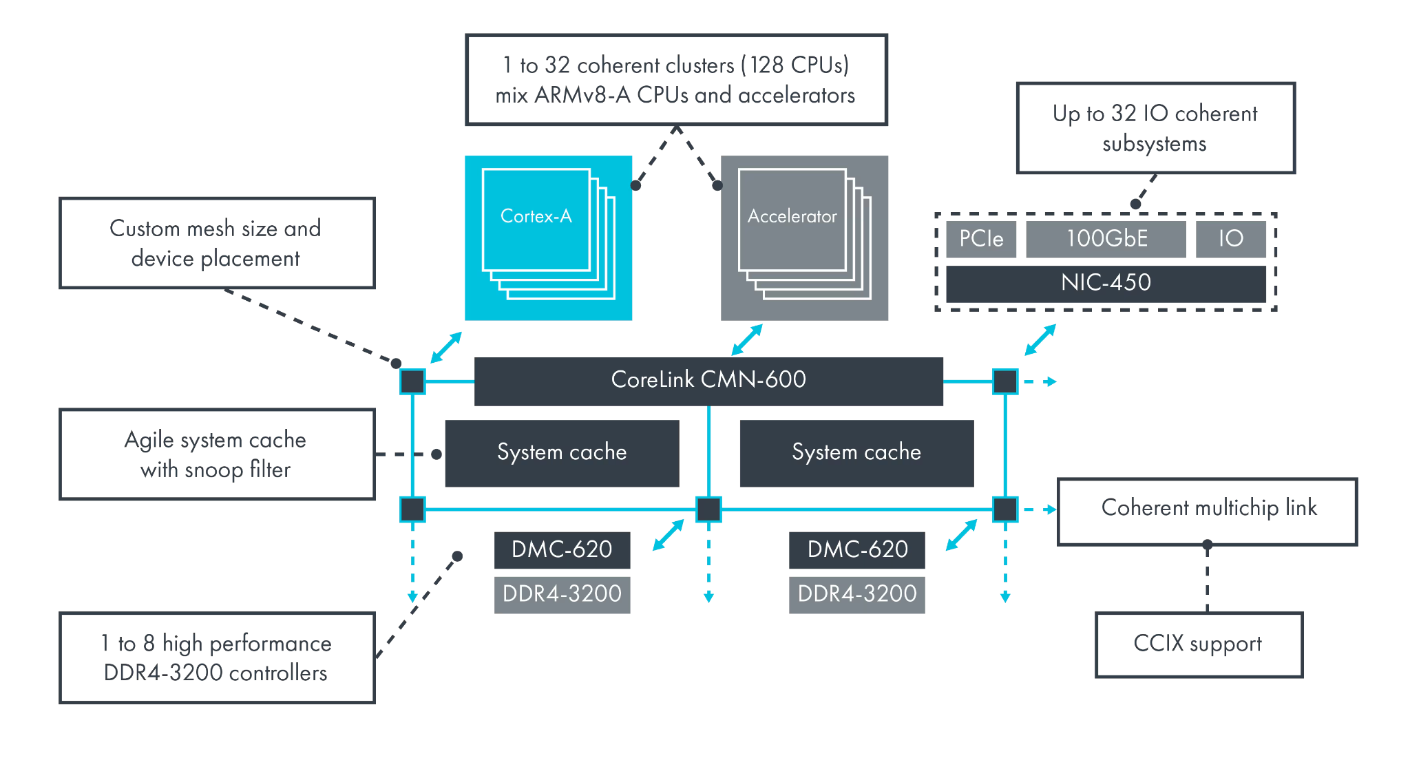 - Advanced support: DMT(Direct memory transfer), DCT(Direct cache transfer), DVM ops, speculative reads, snoop filtering.