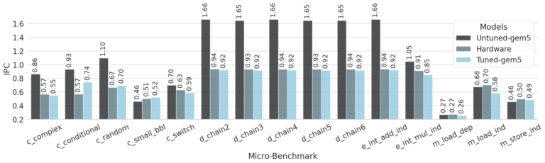 The effect of various parameters on the IPC of the micro-benchmarks was studied. Some trends that were observed are documented in Table I. The three-dimensional relationships among the parameters were visually rendered. The contour plot, prominently featured in the accompanying Figure 1, served as an insightful representation, allowing for the clear depiction of how changes in basic integer operation latency, integer multiply latency, and memory write latency collectively influenced the system. Linear regression was employed to determine optimal parameter values and gain insight into their collective effects, providing both a graphical representation for identification and a nuanced understanding of inter-dependencies among the variables studied. The observed difference of 5% and 10% may be attributed to factors such as initial states of caches, simulation resolution, compiler optimizations, and inherent abstractions in simulations. The errors of the MiBench suite were lesser for the FS than the SE mode of gem5, as shown in Figure 3. The major difference between FS and SE modes is that the FS mode simulates an OS that does scheduling while the SE mode only emulates the system calls. However in this study, the SE and FS mode results were similar attributed to the nature of the benchmarks, which primarily involved arithmetic operations and generated few system calls.