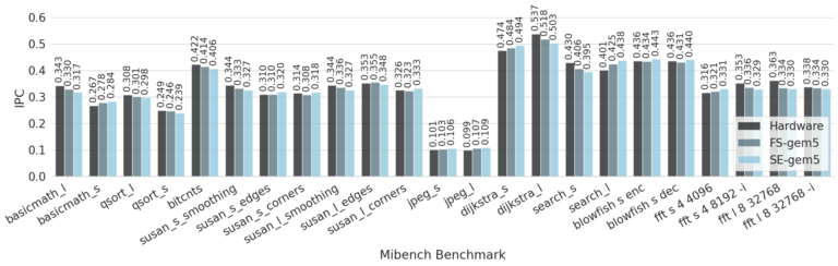 The RISC-V micro-benchmarks [4] and MiBench benchmark suite [5] were executed for CVA6 on two platforms: Kintex xc7k325tffg900- 2 FPGA (50MHz) and the gem5 simulator. These benchmarks were cross-compiled for SE mode and were added as payload in Linux image for the FS mode to test the model. All benchmarks were run for 100, 1k, 10k, 100k, and 1M times to understand the behavior of cache and branch predictor. The micro-architecture parameters affecting a particular micro-benchmark were documented. This information was used to understand which model parameters of micro-architectures were leading to discrepancies. The accuracy of the model was quantitatively determined by calculating the % errors in IPC between software and hardware simulation of each benchmark. Parameters obtained directly from CVA6 documentation and RTL code were retained, while other parameters were adjusted based on their observed impacts on the IPC. To fine-tune the model, the effect of gem5 parameters on IPC behavior was assessed through graphical representations, particularly employing contour plots. To quantitatively evaluate the performance, errors in each benchmark, under various parameter settings, were aggregated using two metrics: the mean of absolute normalized errors and the root mean square (RMS). Employing these metrics, a linear regression model was constructed from the data points to discern optimal parameter values. The result of this optimization process was visually represented through a contour plot, providing a detailed portrayal of the interplay between parameters and performance in the gem5 model. This approach led to an optimal configuration and the results obtained for the micro-benchmarks were then compared with the base model, as illustrated in Figure 2 while the errors of the MiBench suite were also minimized to less than 10% and 8% for the SE and FS modes of gem5, respectively, as shown in Figure 3.